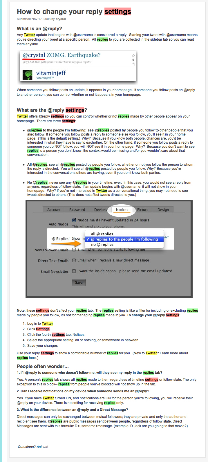 Supposedly, Twitter-users who had the «all @replies»-setting turned on, were more likely to stop using Twitter. Too much noise and information, caused by the fact that they didn’t know what they were doing when opting in.